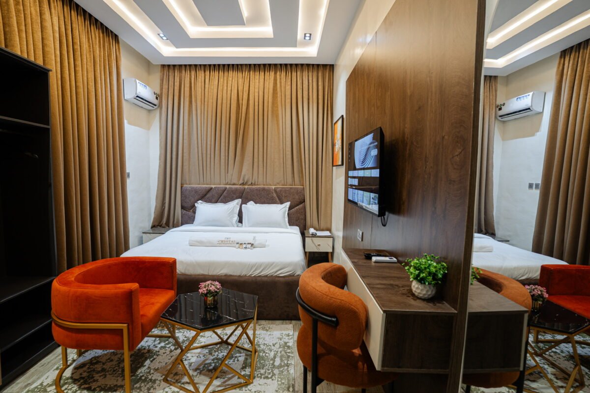 At Crystal Suites & Apartments, we redefine hospitality with exceptional service and modern comfort. Located at No. 42 Solomon Okonkwo Street, Unity Estate, Egbeda, Lagos, our hotel offers the perfect mix of luxury, relaxation, and entertainment — featuring a swimming pool, vibrant lounge, and exclusive club for an unforgettable stay.
